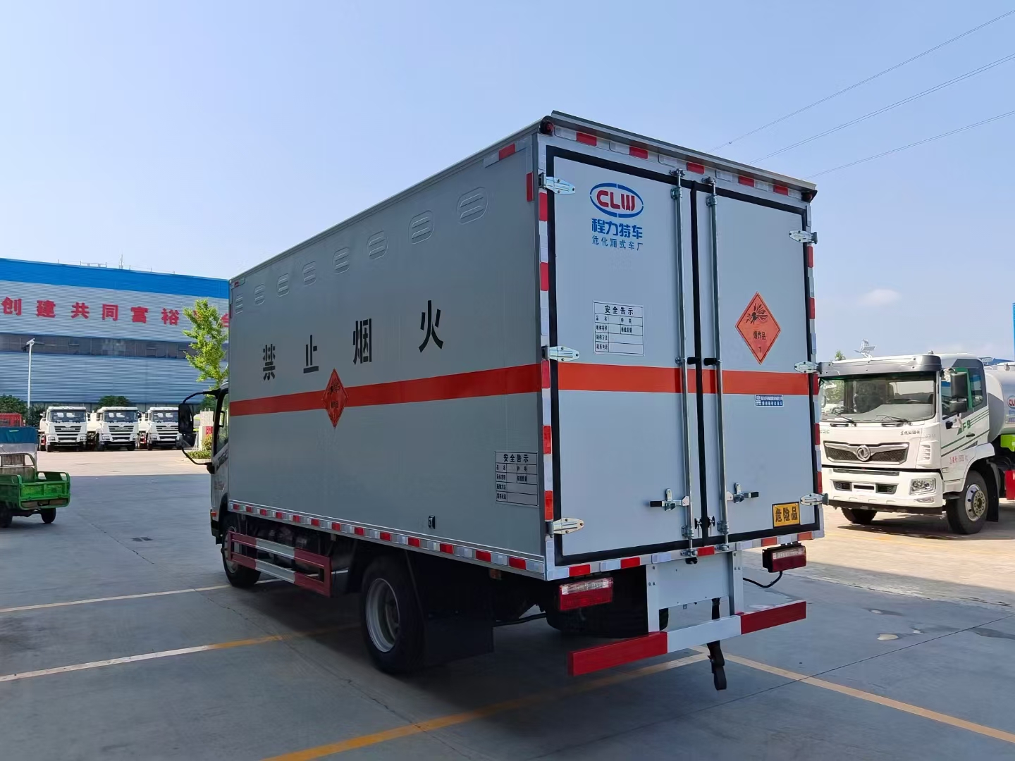 貨箱配置 廂體為雙層金屬骨架結(jié)構(gòu),外板采用冷軋鋼板,中間填充阻燃泡沫,內(nèi)飾為鋁板。底板為平板上鋪防靜電膠皮。廂內(nèi)兩側(cè)加裝固定貨物臥環(huán),門框帶防盜報警器,頂部帶煙霧報警器,廂體右側(cè)選裝側(cè)門,隨車配2個滅火器,危險標(biāo)志牌,防火帽,危險品三角頂燈。 (尾部可選裝液壓升降尾板)