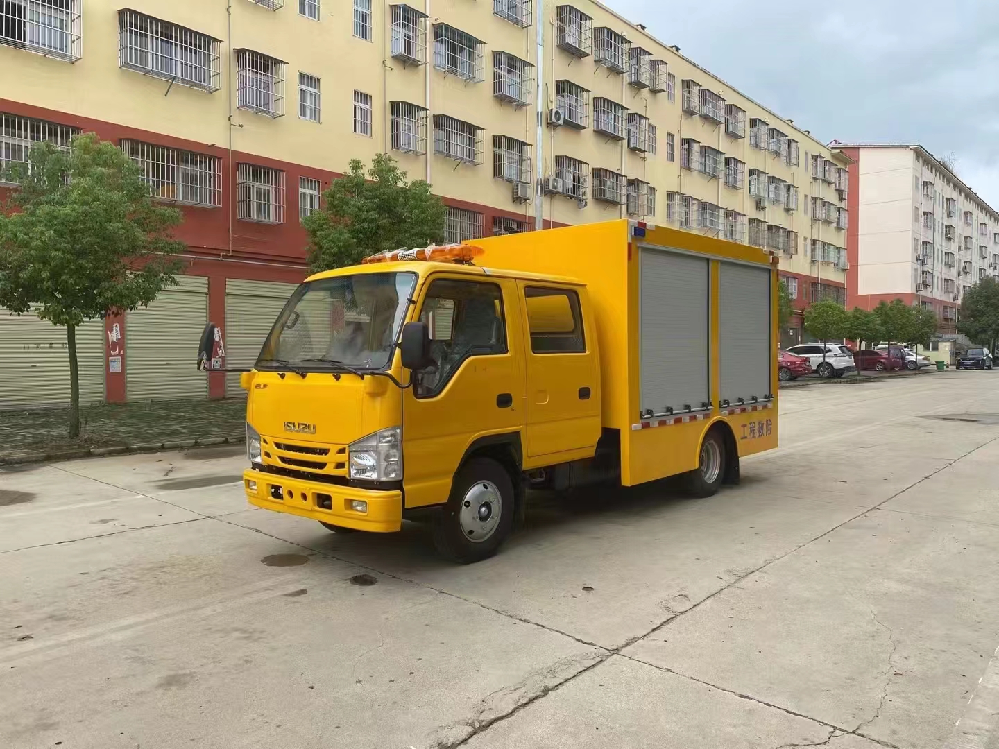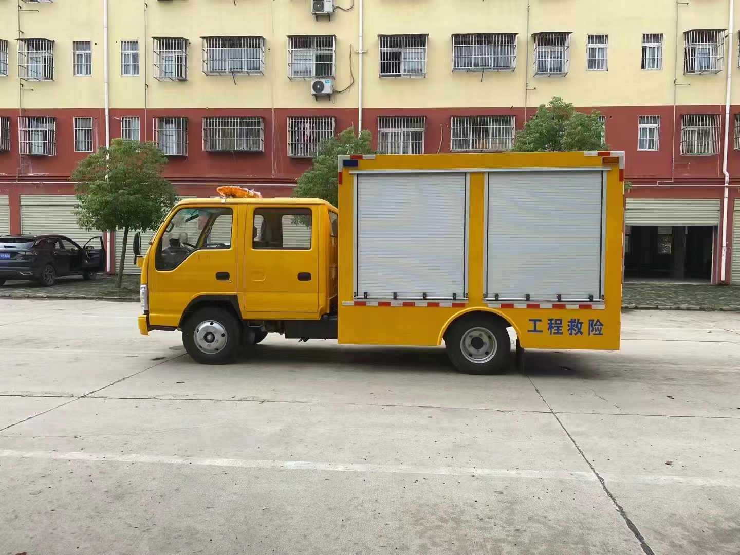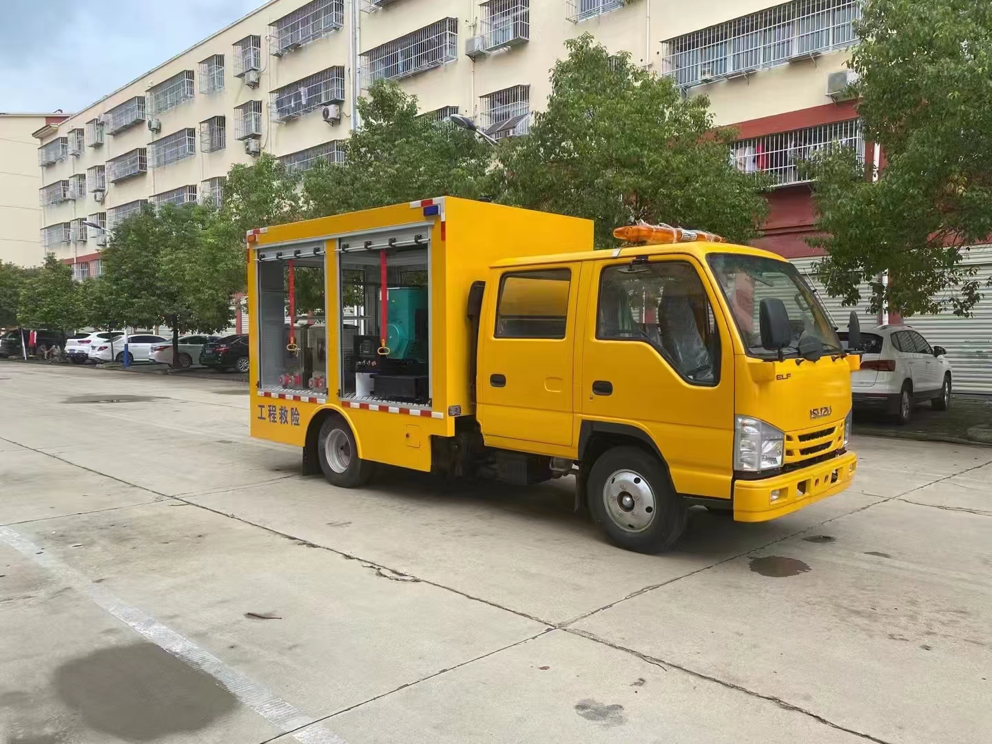 上裝配置  車箱一體式全封閉車箱車箱有隔音功能,廂體防火,阻燃,防雨,防塵,防銹,降噪,隔震,長期抗震結構,廂體外觀按照公告外觀制作,左右卷簾門,尾部是卷簾門,廂內安裝LED作業(yè)燈,作業(yè)燈帶獨立開關,底板采用花紋板。配備康明斯50KW發(fā)電機組,2臺功率22KW便攜式超輕型高速潛水泵,單臺水泵流量可達500m³/h,單泵配40米排水管(20米/根),水管直徑 DN200mm,水管材質為滌綸長絲編織。配有升降照明燈,升降燈可通過無線和有線遙控兩種方式控制,升降燈升降高度為1.2米,可水平旋轉。帶接地樁和接地電纜線,便攜泵控制柜,潛水泵浮圈,長排警燈,倒車影像,配兩只手提式干粉滅火器2只。其余為標配…