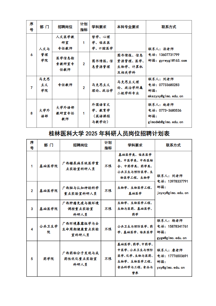 (二)各部門聯(lián)系方式見(jiàn):桂林醫(yī)科大學(xué)各崗位招聘計(jì)劃表。