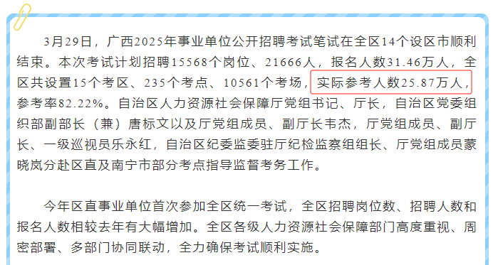今年廣西事編統(tǒng)考報名人數31.46萬人,25.87萬人參考,參考率82.22%