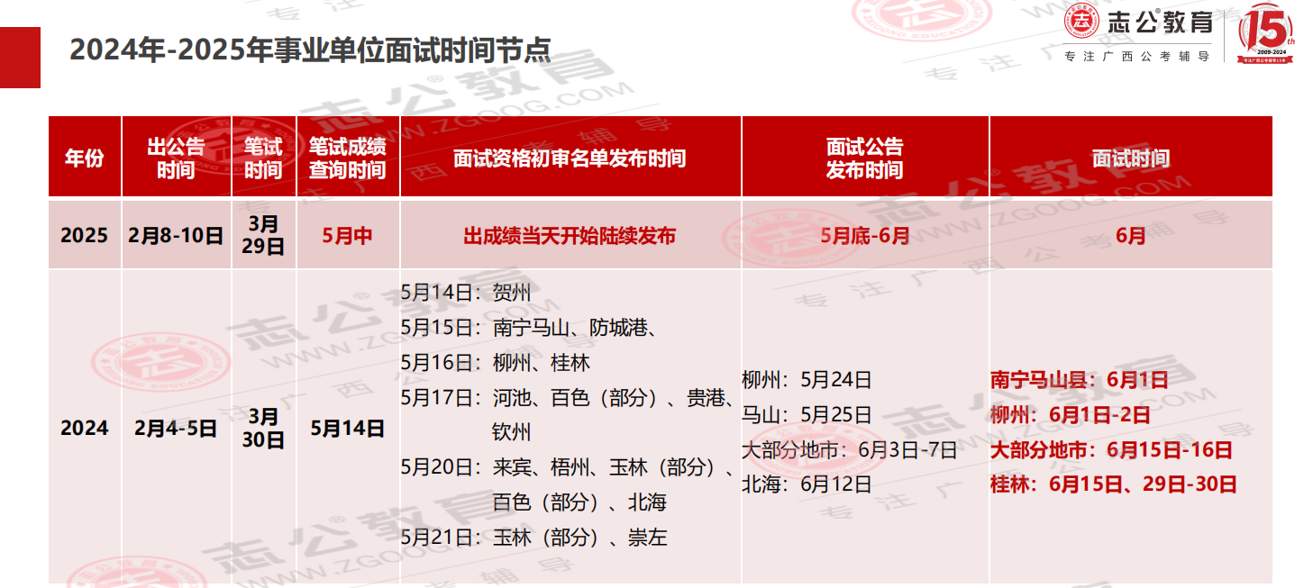 2024年廣西事業(yè)單位3月30日筆試,5月14日成績發(fā)布,最早6月1日面試,出名單到面試間隔僅2周時間備考;2025年3月29日筆試,考試周期和去年基本重合,大家可以參考去年時間,提前備考面試。