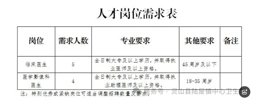 靈山縣陸屋鎮(zhèn)中心衛(wèi)生院(靈山縣第四人民醫(yī)院)根據(jù)發(fā)展需要,現(xiàn)向社會公開招聘以下人員,具體崗位和條件如下: