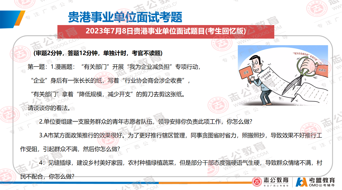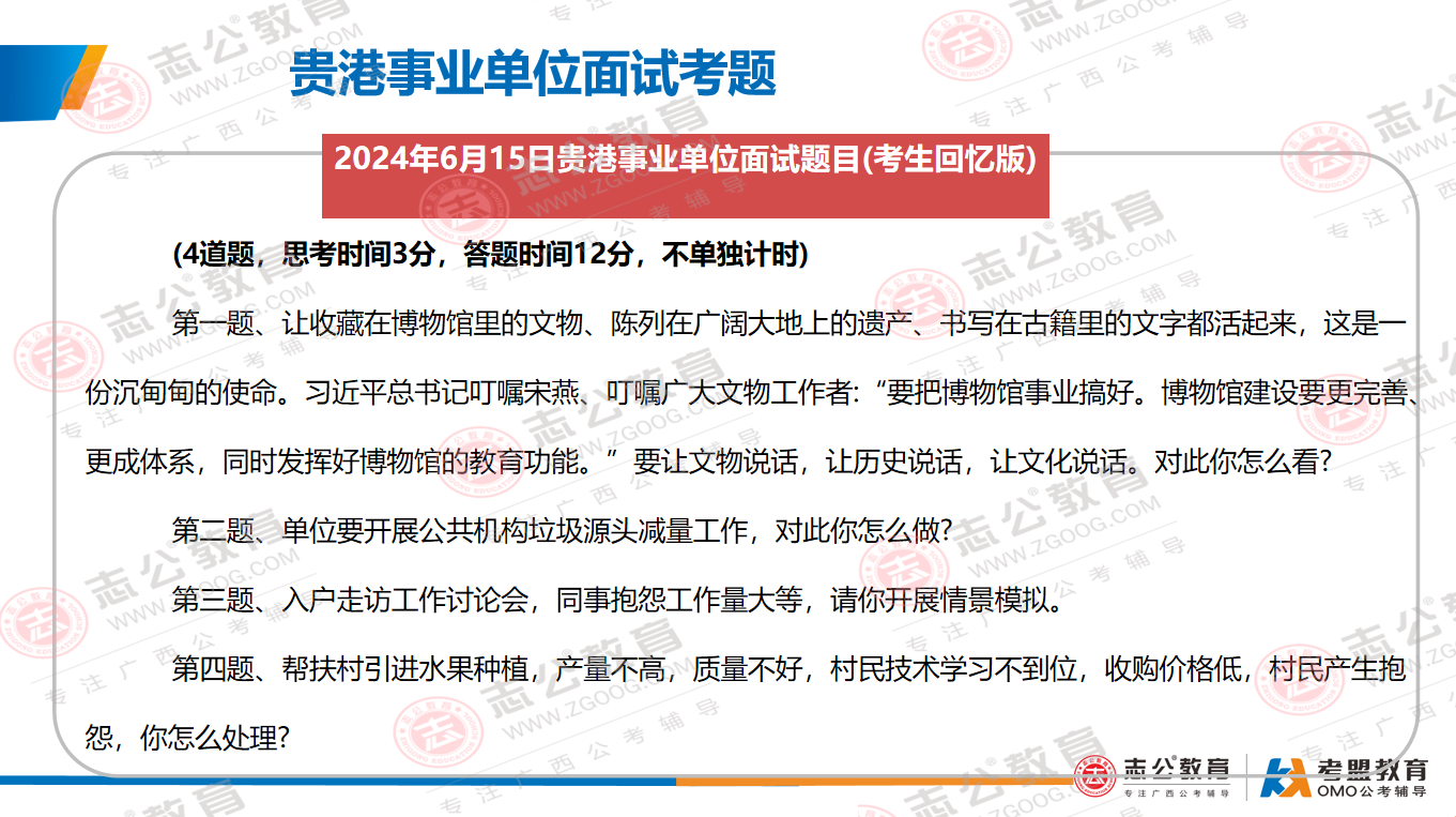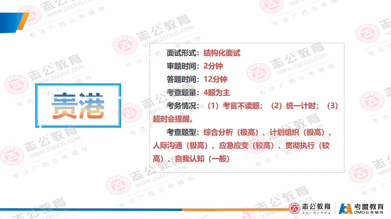 貴港事業(yè)單位面試主要采用結(jié)構(gòu)化面試形式;審題時間:2分鐘;答題時間:12分鐘;考查題量:4題為主。考務(wù)情況:考官不讀題、統(tǒng)一計(jì)時、超時會提醒??疾轭}型:綜合分析(極高)、計(jì)劃組織(極高)、人際溝通(極高)、應(yīng)急應(yīng)變(較高)、貫徹執(zhí)行(較高)、自我認(rèn)知(一般)。