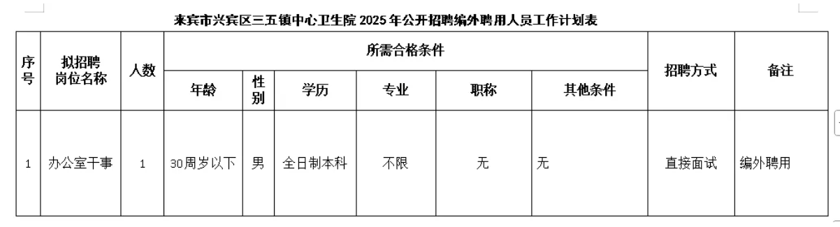 原文標(biāo)題:來賓市興賓區(qū)三五鎮(zhèn)中心衛(wèi)生院 2025年公開招聘編外工作人員公告