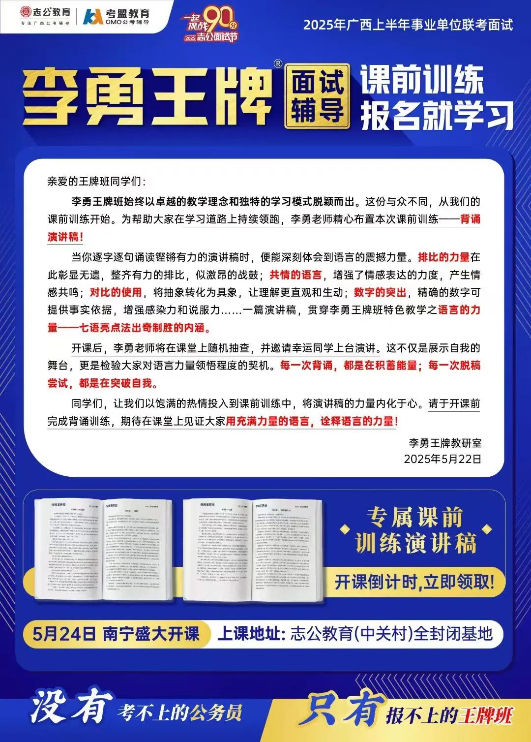 繼志公教育&李勇王牌®班教研室5月17日發(fā)布修改招生規(guī)則的通知后,各位未來(lái)“橘”長(zhǎng)們,翹首以盼的時(shí)刻終于來(lái)啦!5月24日,志公教育李勇王牌®班——改革后的首個(gè)開(kāi)班,在南寧火熱啟幕!現(xiàn)場(chǎng)學(xué)習(xí)氣氛爆棚,李勇老師與學(xué)員高頻互動(dòng),學(xué)員們直呼 “學(xué)到停不下來(lái)”!這不僅是一場(chǎng)面試特訓(xùn),更是一次思維與能力的雙重蛻變!