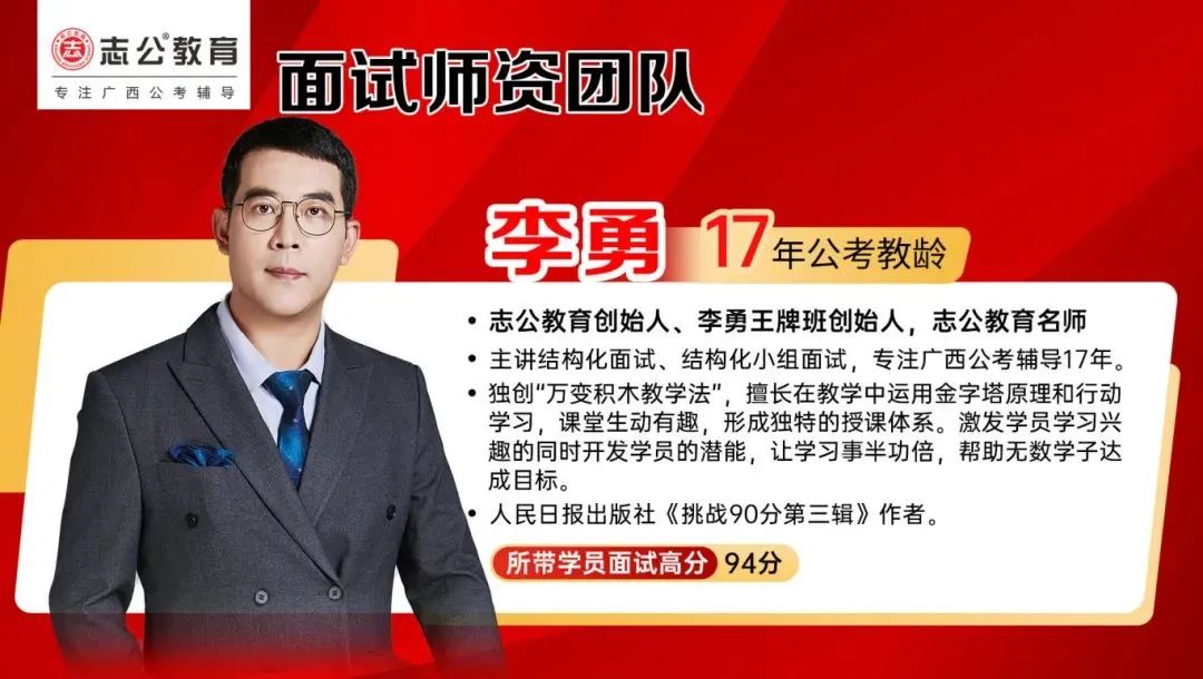 李勇——志公教育創(chuàng)始人、李勇王牌®班創(chuàng)始人,志公教育名師。主講結(jié)構(gòu)化面試、結(jié)構(gòu)化小組面試,專注廣西公考輔導(dǎo)17年。獨(dú)創(chuàng)“萬(wàn)變積木教學(xué)法”,擅長(zhǎng)在教學(xué)中運(yùn)用金字塔原理和行動(dòng)學(xué)習(xí),課堂生動(dòng)有趣,形成獨(dú)特的授課體系。激發(fā)學(xué)員學(xué)習(xí)興趣的同時(shí)開(kāi)發(fā)學(xué)員的潛能,讓學(xué)習(xí)事半功倍,幫助無(wú)數(shù)學(xué)子達(dá)成目標(biāo)。同時(shí)也是人民日?qǐng)?bào)出版社《挑戰(zhàn)90分第三輯》作者。