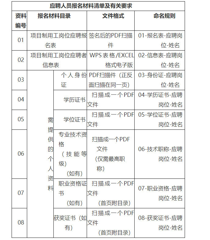 應(yīng)聘人員按照《應(yīng)聘人員報名材料清單及有關(guān)要求》提供相應(yīng)報名材料,壓縮成一個文件(文件名和郵件主題統(tǒng)一以本人姓名進(jìn)行命名),發(fā)送至電子郵箱:515827308@qq.com。本次招聘僅接受電子郵件方式報名,報名材料一經(jīng)提交不能修改。