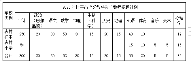 經(jīng)自治區(qū)教育廳、黨委編辦、財(cái)政廳、人社廳批準(zhǔn),2025年桂平市“義教特崗”教師招聘計(jì)劃共300名,其中初中250名、小學(xué)50名。詳情見(jiàn)下表: