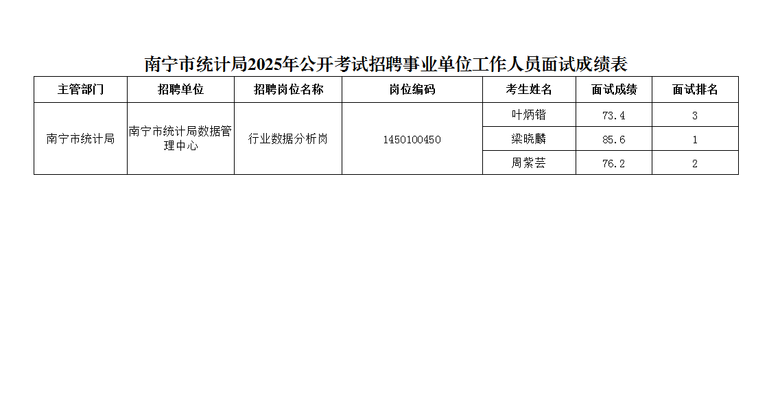 原文標(biāo)題:南寧市統(tǒng)計(jì)局2025年公開考試招聘事業(yè)單位工作人員面試成績表