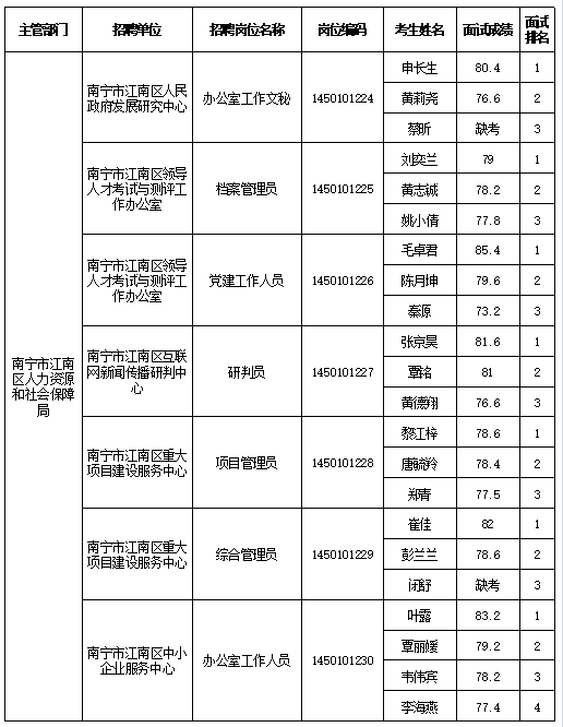 南寧市江南區(qū)人力資源和社會(huì)保障局2025年公開(kāi)考試招聘事業(yè)單位工作人員面試成績(jī)表
