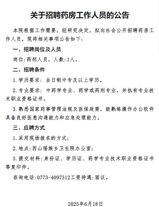 原文標(biāo)題:灌陽(yáng)縣西山瑤族鄉(xiāng)衛(wèi)生院關(guān)于招聘藥房工作人員的公告