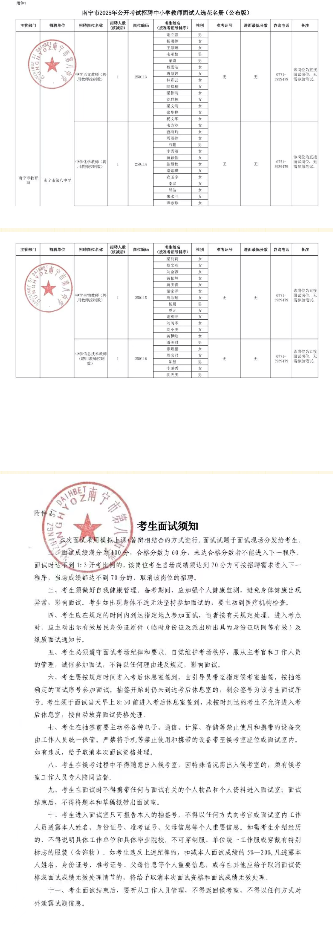 附件:1.南寧市2025年公開考試招聘中小學教師南寧南分市第八中學面試人選花名冊