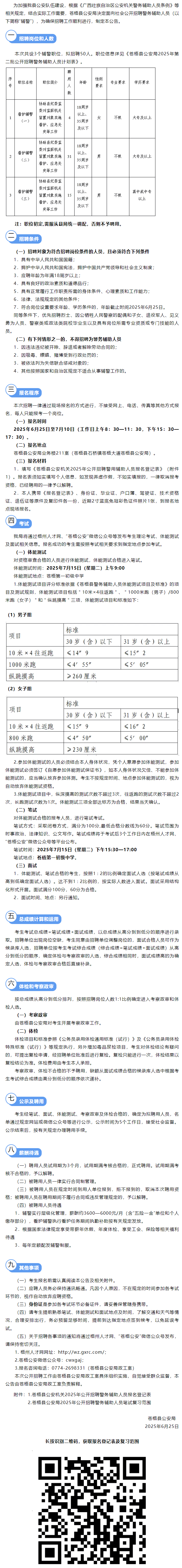 2025年蒼梧縣公安局第二批公開(kāi)招聘警務(wù)輔助人員50人