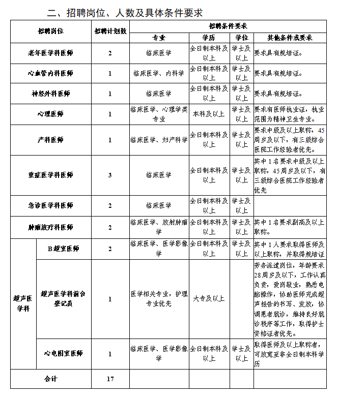 注:初中級職稱應(yīng)聘人員原則上年齡要求為35周歲及以下;如為副高以上職稱,年齡可放寬至45周歲;學(xué)歷層次高者優(yōu)先。醫(yī)師崗位中如要求具有規(guī)培證條件的是指已取得規(guī)培合格證書(含通過規(guī)培結(jié)業(yè)考試未領(lǐng)合格證書)或已取得中級及以上職稱人員。