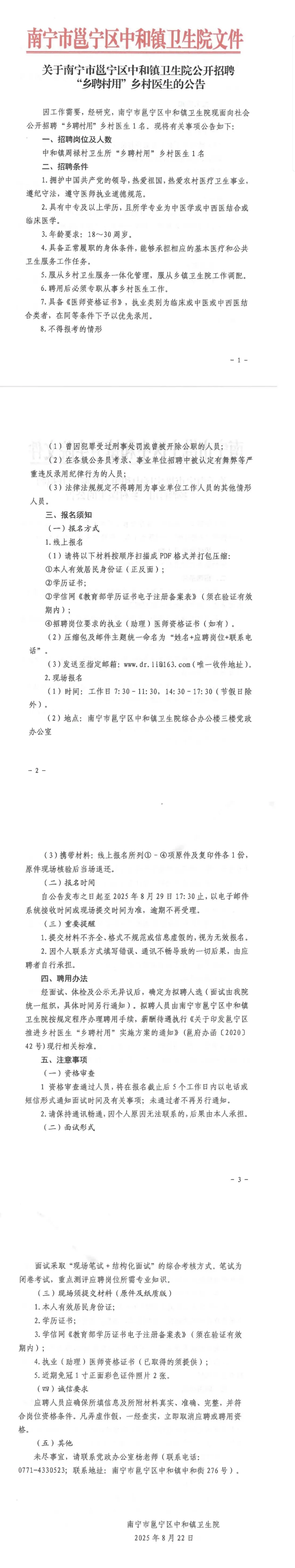 2025年南寧市邕寧區(qū)中和鎮(zhèn)衛(wèi)生院公開招聘“鄉(xiāng)聘村用”鄉(xiāng)村醫(yī)生的公告