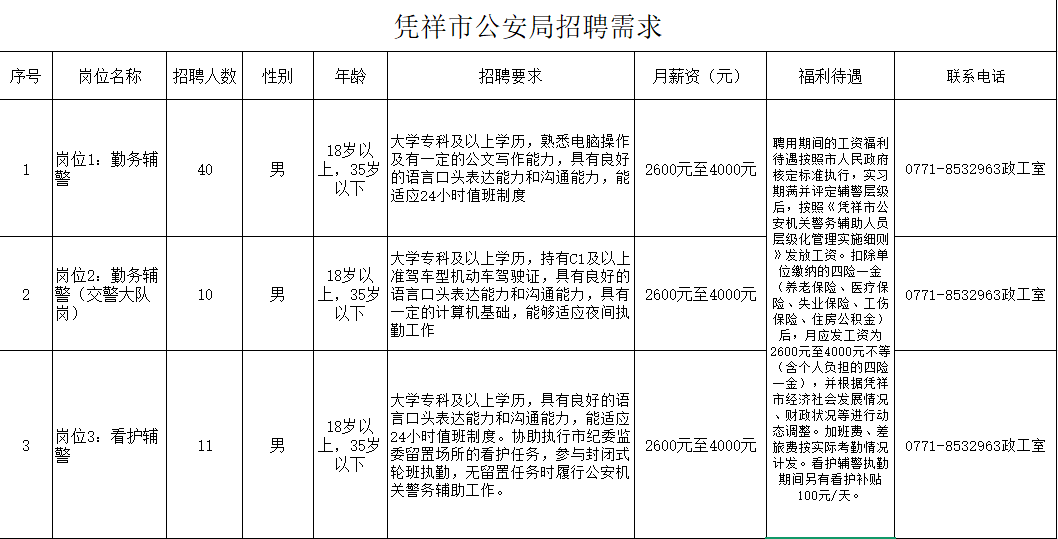 為適應(yīng)憑祥市公安機(jī)關(guān)管理工作發(fā)展需要,憑祥市公安局決定面向社會公開招聘61名警務(wù)輔助人員(以下簡稱輔警)。具體事宜如下: