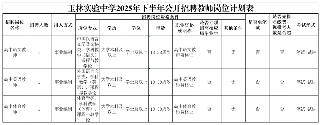 具體招聘信息請瀏覽玉林市人社局網站相關公告,以《玉林市2025年下半年公開招聘中小學幼兒園教師公告》為準。