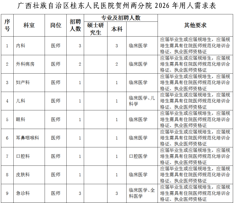 (應(yīng)聘報(bào)名二維碼)同時(shí),按以下要求提供個(gè)人應(yīng)聘材料(電子版)發(fā)電子郵箱:gdyy2817726@163.com(郵件主題請(qǐng)標(biāo)明:“姓名+賀州兩分院”字樣)。應(yīng)屆畢業(yè)生:個(gè)人簡(jiǎn)歷、身份證、就業(yè)推薦表、成績(jī)單、各種獎(jiǎng)項(xiàng)獎(jiǎng)勵(lì)證書、外語(yǔ)等級(jí)證書等。非應(yīng)屆畢業(yè)生:個(gè)人簡(jiǎn)歷、身份證、畢業(yè)證、畢業(yè)證備案登記表、學(xué)位證、學(xué)位證備案登記表、職稱證、執(zhí)業(yè)證、住院醫(yī)師規(guī)范化培訓(xùn)合格證、工作證明等。報(bào)名時(shí)所提交的申請(qǐng)材料必須真實(shí)、準(zhǔn)確,因報(bào)名時(shí)提交的申請(qǐng)材料不真實(shí)、不完整或錯(cuò)誤填寫報(bào)名信息,造成資格審查、面試資格審查不通過(guò)的,后果由報(bào)名人員自行承擔(dān)。(2)資格審核。人事科依據(jù)招聘公告和用人需求規(guī)定的資格條件對(duì)應(yīng)聘人員簡(jiǎn)歷進(jìn)行收集和資格初步審查,經(jīng)招聘工作領(lǐng)導(dǎo)小組審核后,確定符合崗位條件報(bào)名人員名單,由醫(yī)院人事科電話或短信通知符合條件人員。(3)考核??己斯P試和面試由人事科負(fù)責(zé)組織實(shí)施,協(xié)助部門為醫(yī)務(wù)部、護(hù)理部、科教科以及用人科室,紀(jì)律監(jiān)督部門為監(jiān)察室。逾期未參加則視為自愿放棄。(4)試工。通過(guò)考核的非應(yīng)屆畢業(yè)應(yīng)聘人員,須到醫(yī)院試工5天。試工不通過(guò),不予聘用。(5)體檢。體檢工作由廣西壯族自治區(qū)桂東人民醫(yī)院按照有關(guān)規(guī)定統(tǒng)一組織。體檢標(biāo)準(zhǔn)參照《廣西壯族自治區(qū)事業(yè)單位公開(kāi)招聘人員體檢通用標(biāo)準(zhǔn)(試行)》《廣西壯族自治區(qū)事業(yè)單位公開(kāi)招聘人員體檢操作手冊(cè)(試行)》執(zhí)行。體檢不合格或隱瞞真實(shí)情況致使體檢結(jié)果失真的,不予聘用。因體檢不合格空缺崗位的,將按考核的綜合成績(jī),從高到低,順位補(bǔ)充體檢人員。(6)公示和聘用。對(duì)擬聘非應(yīng)屆畢業(yè)應(yīng)聘者在全院范圍內(nèi)進(jìn)行公示,公示期為5個(gè)工作日,公示期滿無(wú)異議按程序辦理聘用手續(xù)。對(duì)公示有異議,經(jīng)核實(shí)影響聘用的,取消其聘用資格;對(duì)反映問(wèn)題難以核實(shí)的暫緩聘用,待核實(shí)清楚后按有關(guān)規(guī)定辦理。