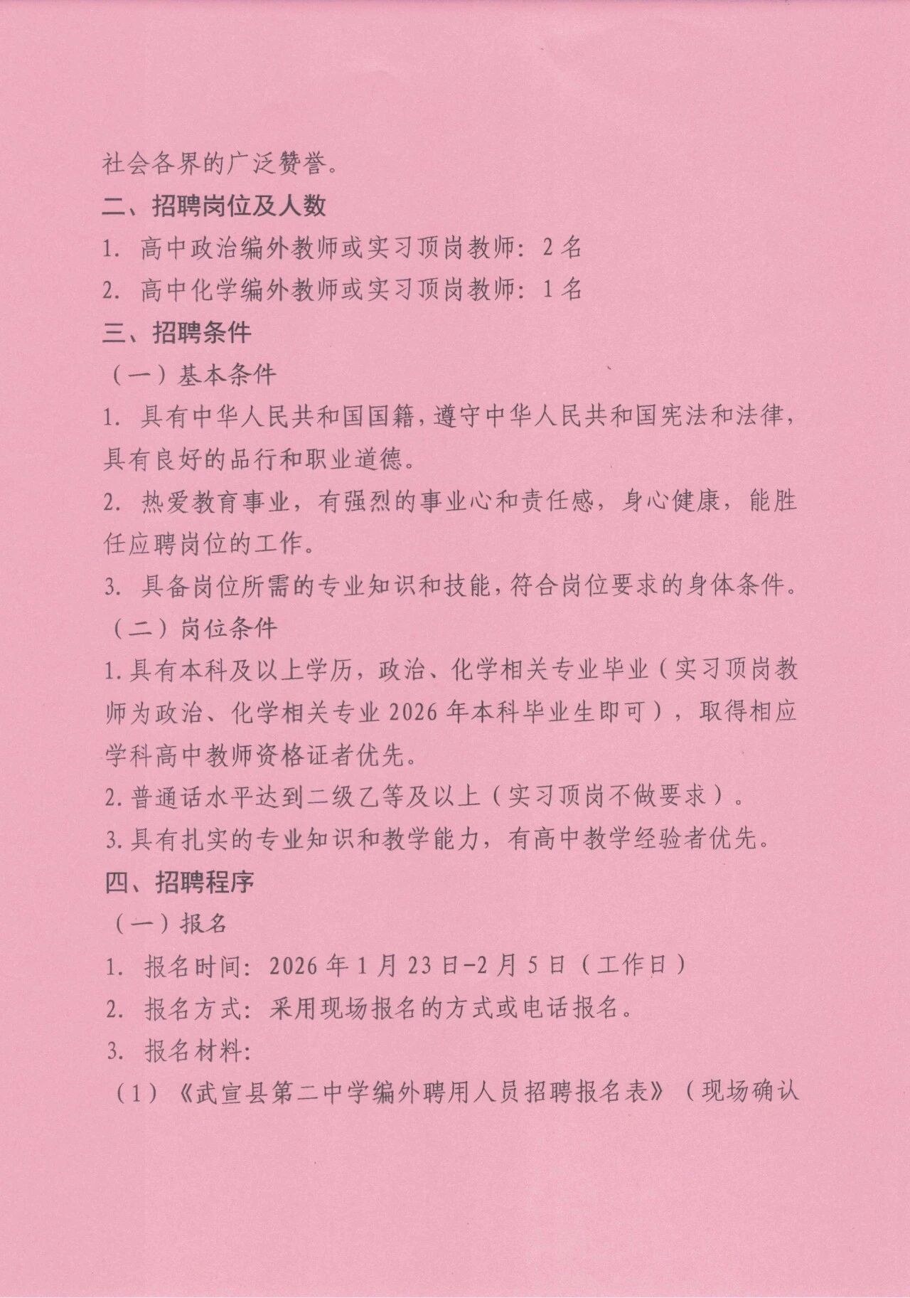 2026年來賓武宣縣第二中學編外(頂崗)教師招聘3人